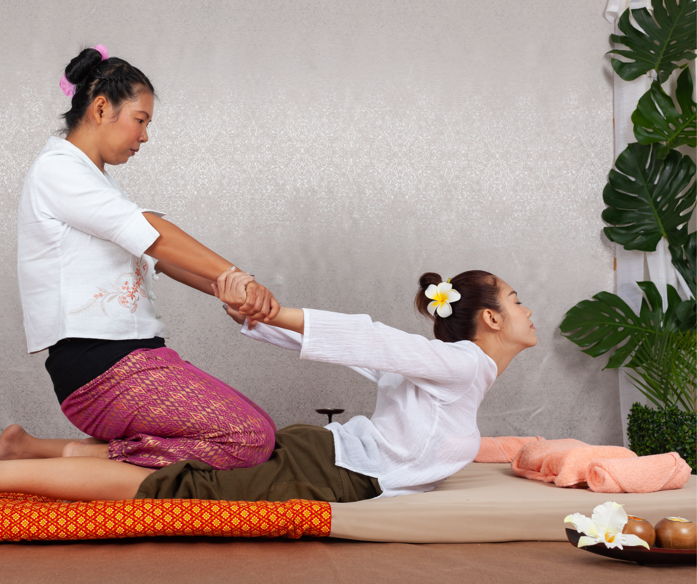 A dynamic, full-body session performed fully clothed on a cushioned floor mat. Traditional Thai bodywork blends centuries-old techniques with assisted stretching and elements of sports massage to enhance flexibility, mobility, and muscle recovery.